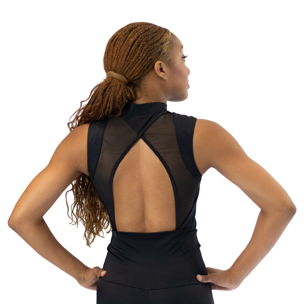Cap sleeve mock neck leotard with strappy back with unlined power mesh insets